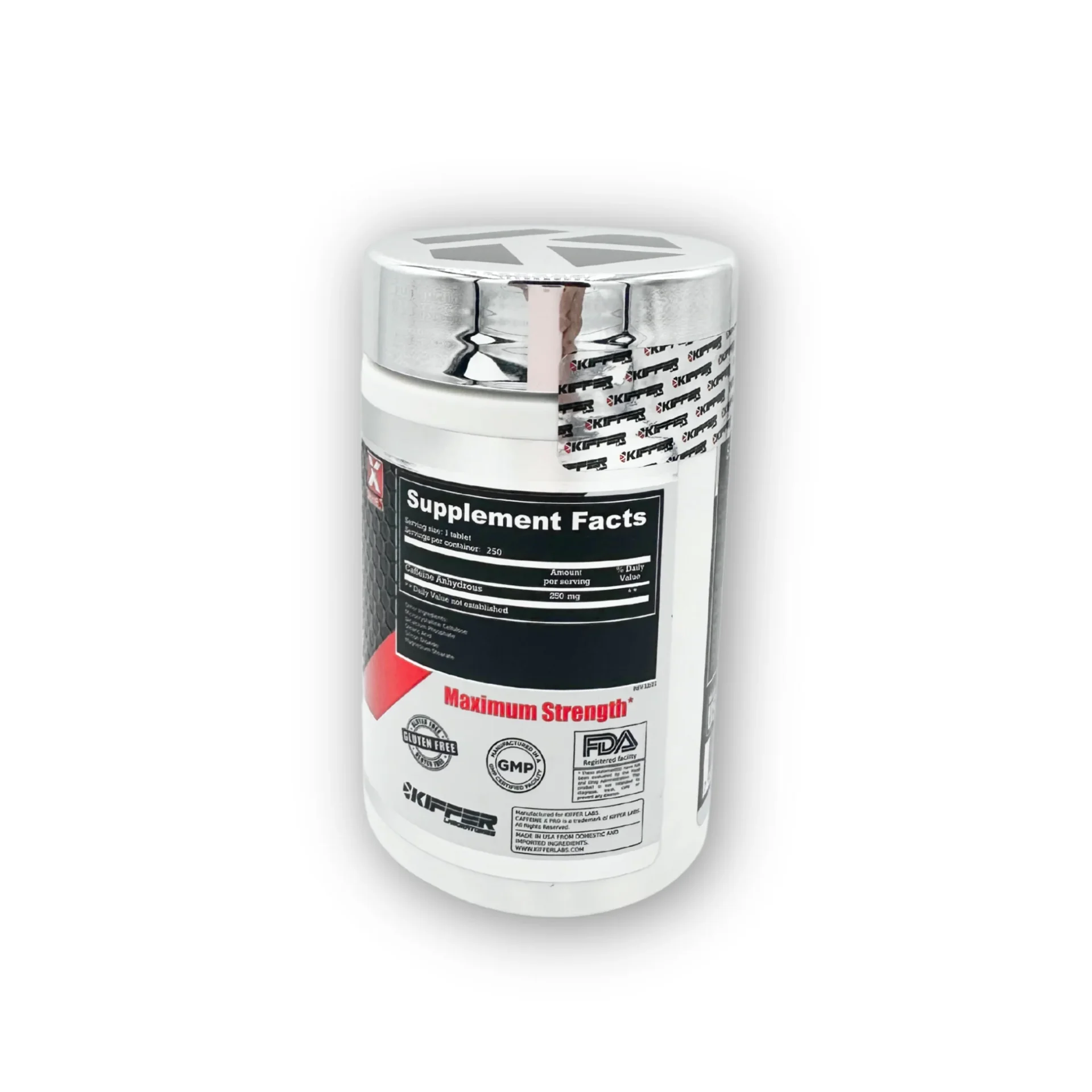Frasco con 250 tabletas de cafeína pura (250 mg cada una).