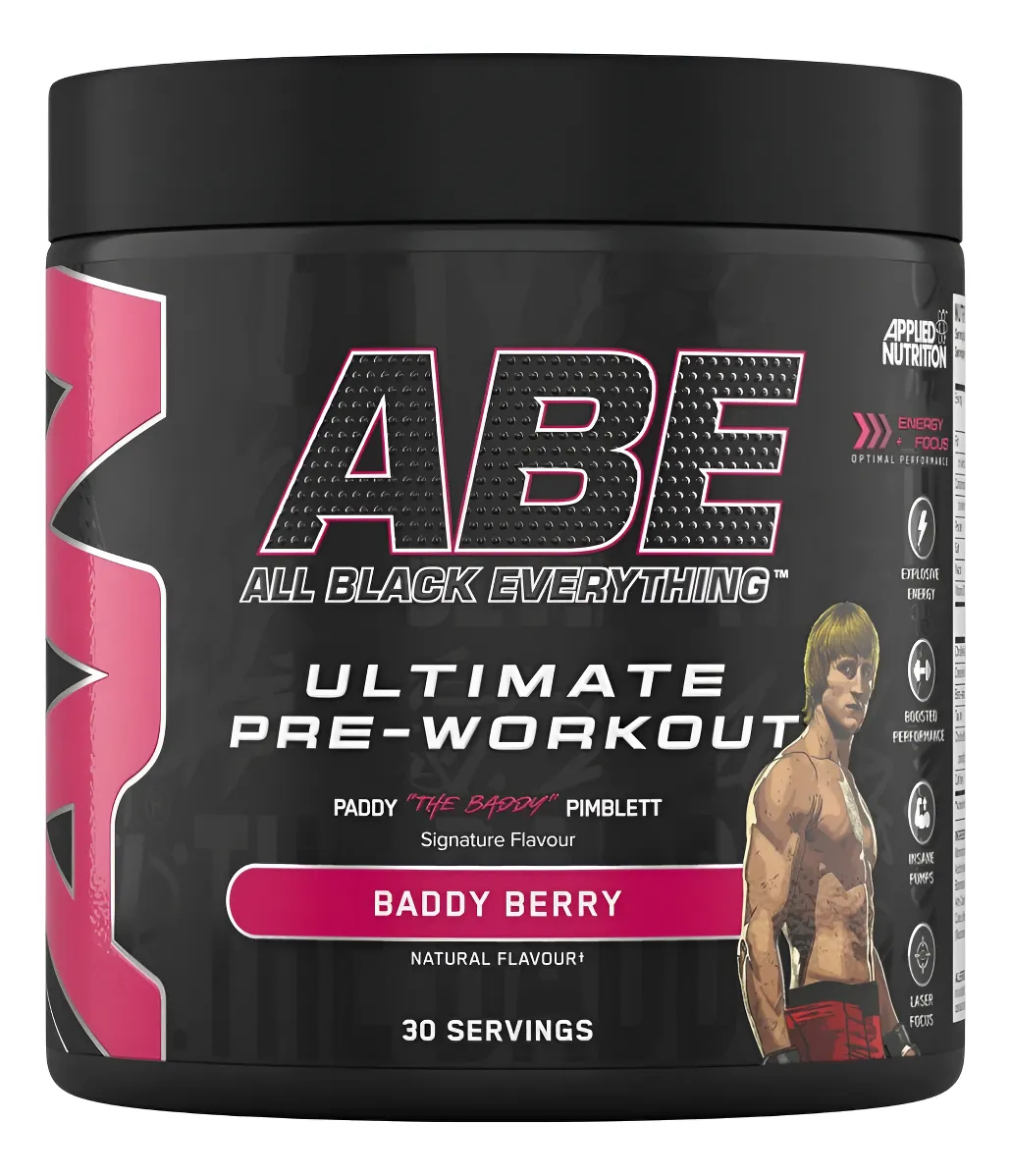 Pre entreno ABE Baddy Berry 375g en polvo. Suplemento sabor manzana ácida con cafeína, creatina y citrulina.